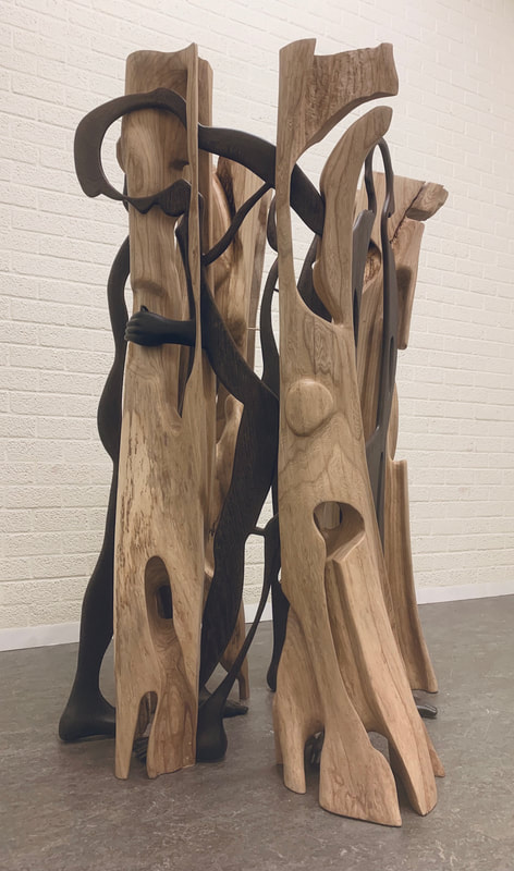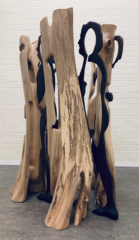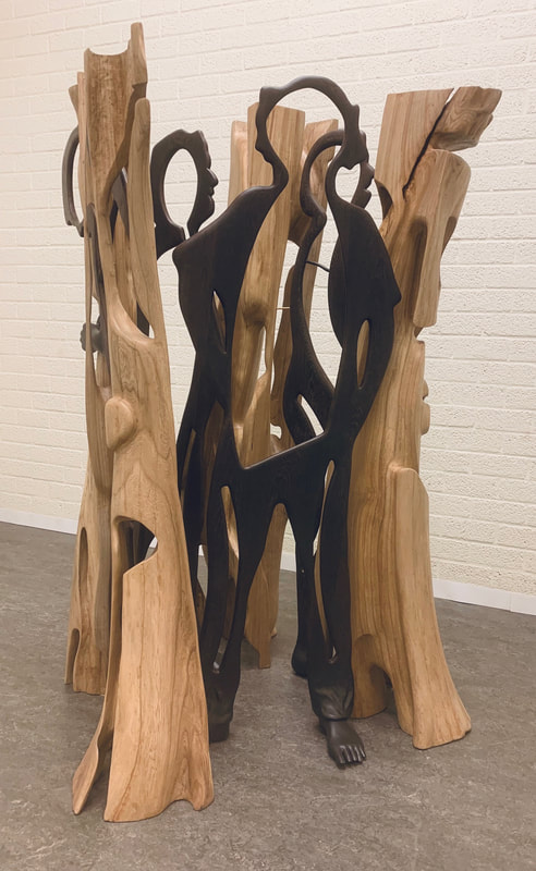 De vier menselijke figuren zijn van de houtsoort wengé. Wengé staat voor de kwetsbaarheid en vergankelijk van de mens.